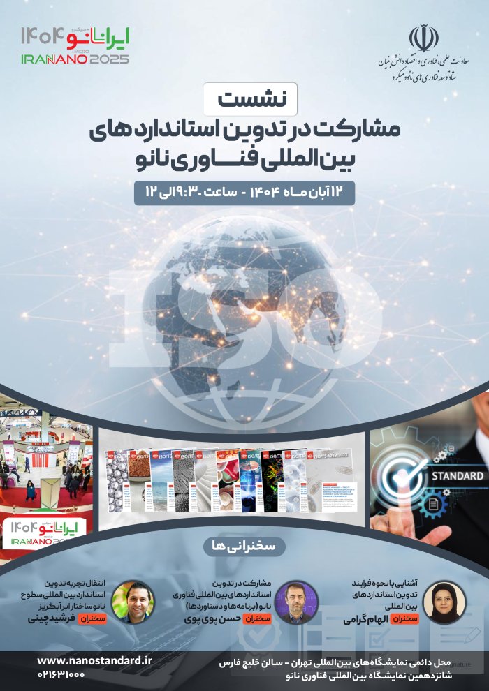 نشست تخصصی «مشارکت در تدوین استانداردهای بین‌المللی» با هدف بررسی نقش ایران در فرآیند استانداردسازی جهانی و انتقال تجربیات فعالان این حوزه، با حضور نمایندگان سازمان ملی استاندارد، ستاد ویژه توسعه فناوری نانو و شرکت‌های دانش‌بنیان، در سالن صدف مرکز همایش‌های خلیج فارس برگزار شد.